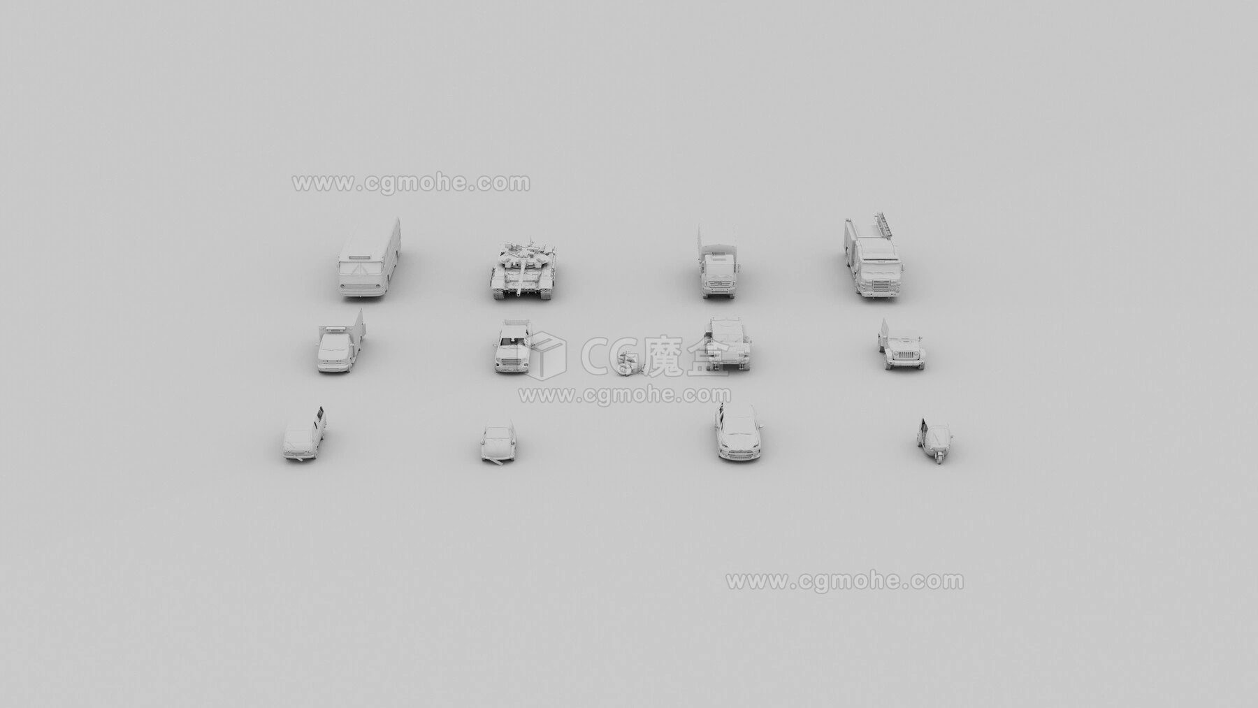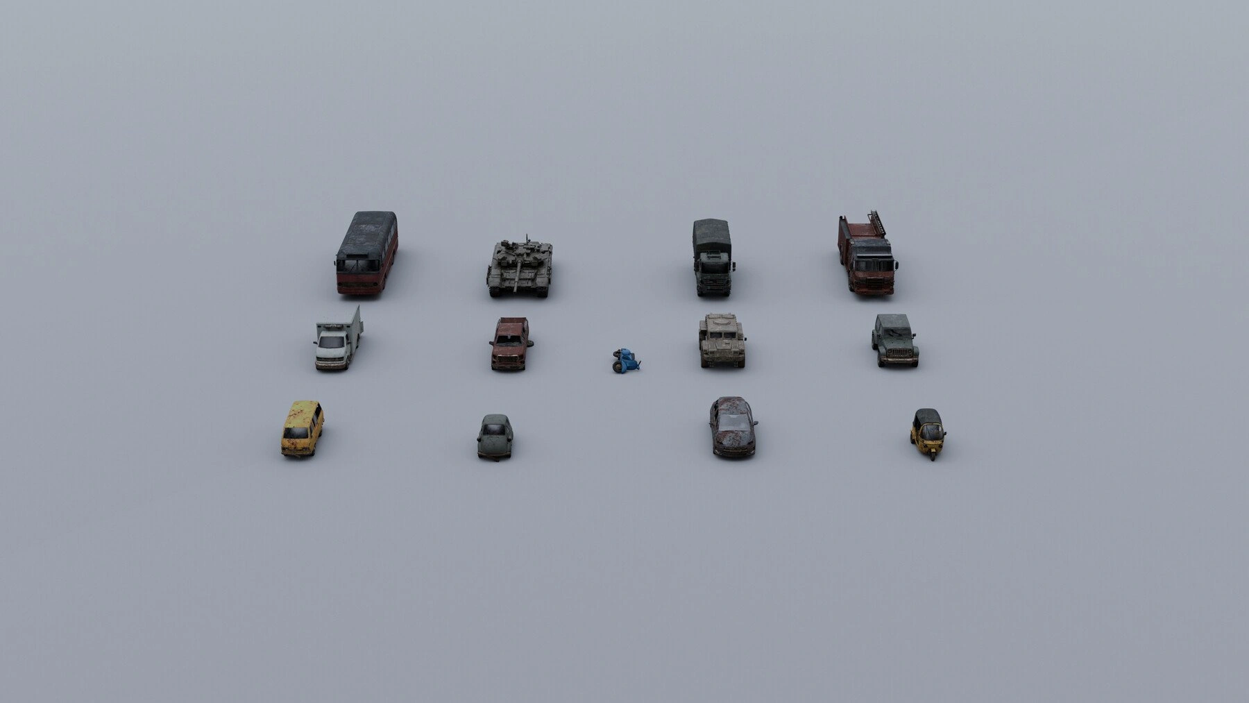 包含悍马 、吉普车、卡车、救火车、坦克、救护车、巴士、小型货车、红色吉普车、嘟嘟车、黑车、滑板车、迷你车等破旧风格3D模型,适用于启示录/反乌托邦场景中的场景设计。四边面,车辆采用8K纹理,每个模型都配有“反射”、“粗糙度”和“法线”贴图。